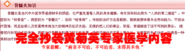 重要提示:1、该文章的内容及文字通俗表述,例如:骨髓炎俗称:“蛀骨病”,“骨髓炎”只有在广东黄菊英专家揭西客家人地区,才使用“蛀骨病”的客家话俗语。2、专利发明人:黄菊英专家2002年发表关于治疗骨髓炎40多年经验的医学精华,并在2002年10月,在北京人民大会堂出席第二届全国名医大会并在会上作了骨髓炎的相关学术报告。请看网站黄菊英出席名医大会具体介绍。抄袭案例截图如下:请患者朋友认真对比,用你专业的眼光辨别真假李逵!