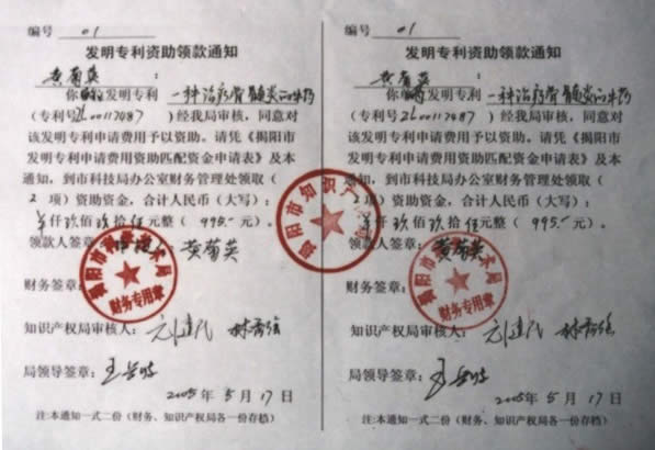 | 2005年5月17日,广东揭西黄菊英中医治疗骨髓炎专利实施中心,荣获了揭阳市科学技术局、揭阳市知识产权局共同颁发的专利资助金,黄菊英中医治疗骨髓炎专利实施中心的专利项目是揭阳地区第一个荣获此资助金的部门。 |